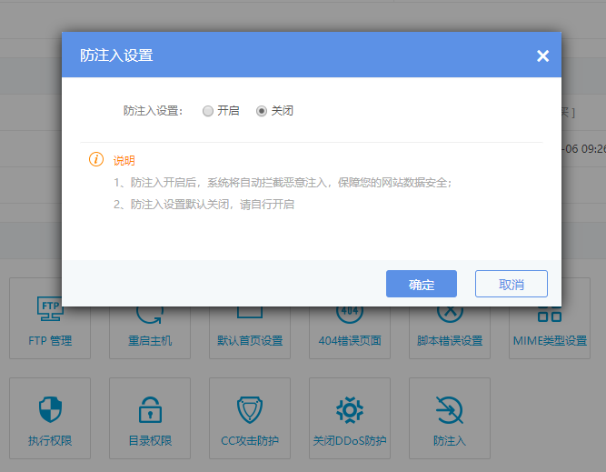 防注入开启后,系统将自动拦截恶意注入,保障您的网站数据安全。